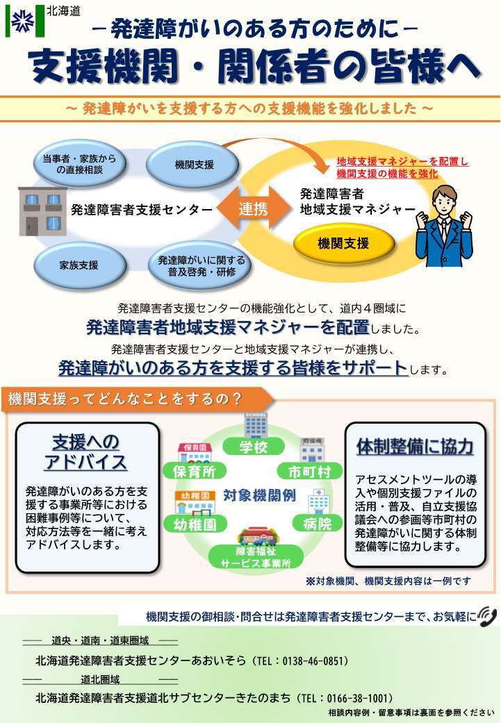 北海道では、発達障害者支援法に基づき、発達障害者支援(サブ)センターを設置しています。