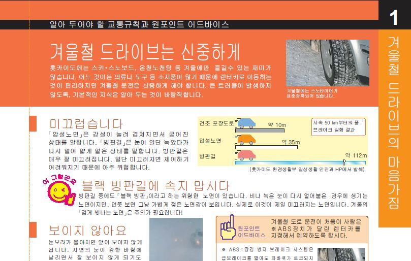 Copyright © 2008-2019 Hokkaido Government All Rights Reserved. 다운로드 안내도(앞면) (PDF/ 3,033KB) 안내도(뒷면) (PDF/ 2,338KB) 겨울철 드라이브의 마음가짐 (PDF/ 236KB) 외부 링크 【홋카이도 경찰】Traffic Safety Information for Foreign Nationals 【홋카이도 개발국】Tourism Information 【삿포로 렌트카 협회】Drive In Hokkaido
