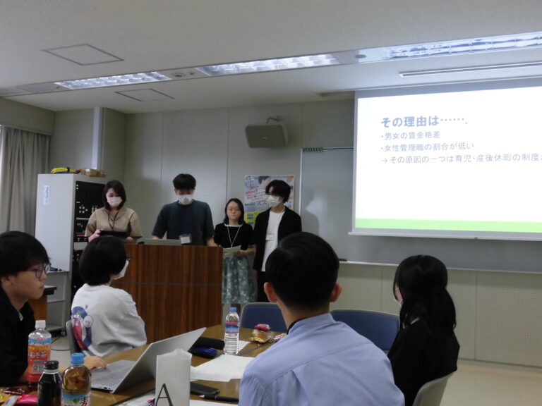 2日間のワークショップの最後に、各班より、女性活躍が見られる企業の特徴や女性活躍を推進するために組織に求められる制度について、発表していただきました。