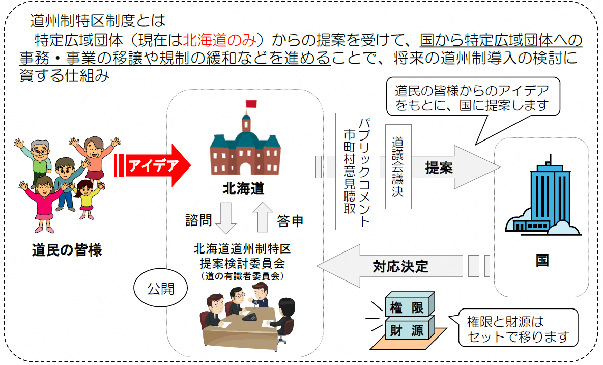 このような権限を移してほしい、この法律をこう改正してほしいという提案を北海道知事が総理大臣に直接言うことができ、さらに、国から権限が移ってくるときは、お金もセットで移ってくることも法律で保証されています。