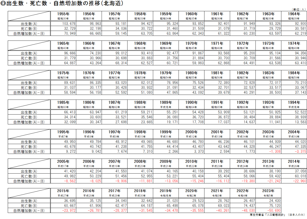 【NEW】出生数・死亡数・自然増加数の推移(北海道)