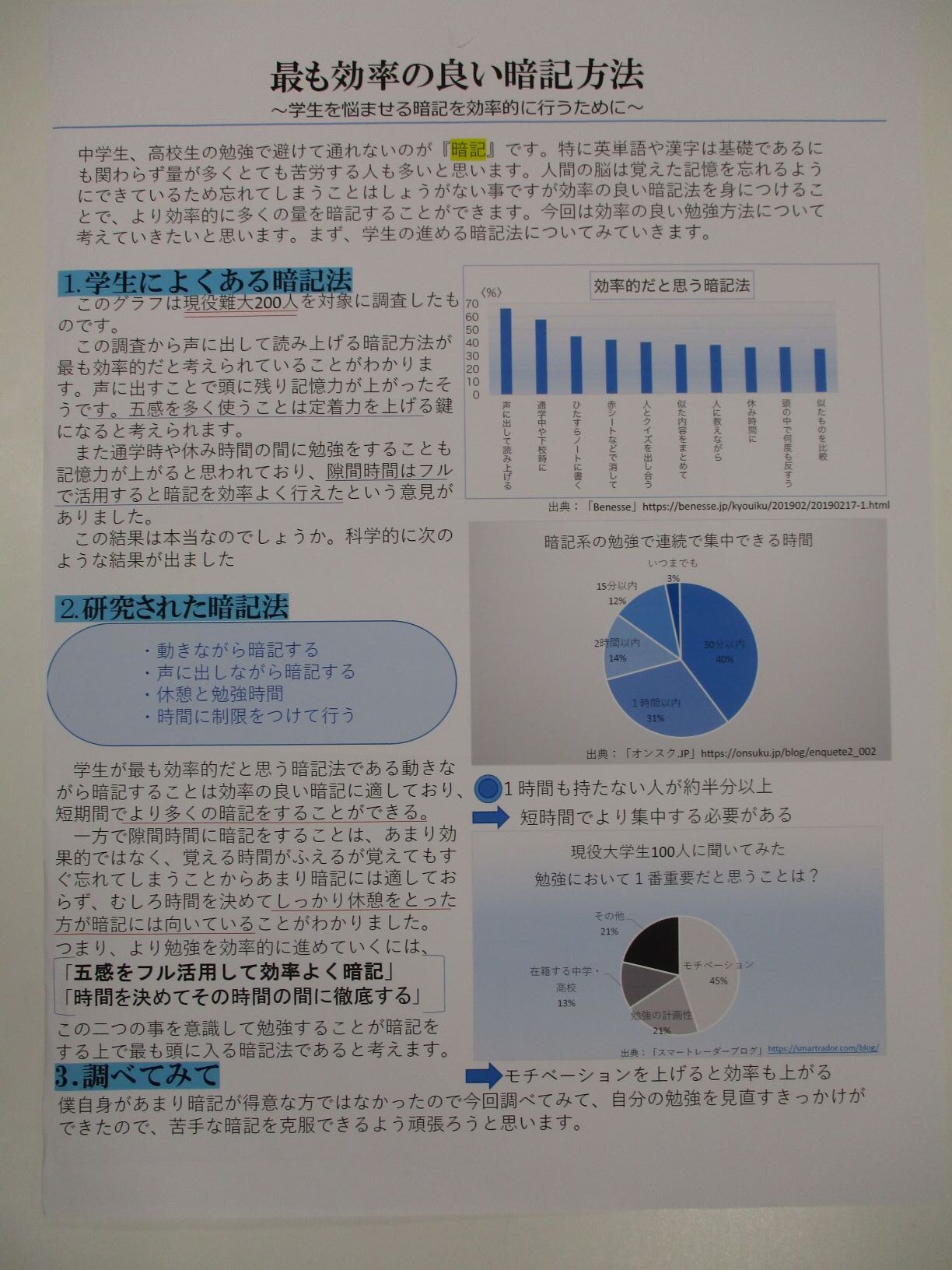 | 佳作 | 最も効率の良い暗記方法~学生を悩ませる暗記を効率的に行うために~ | 羽山 烈 | 市立札幌旭丘高等学校 | 高1 | |