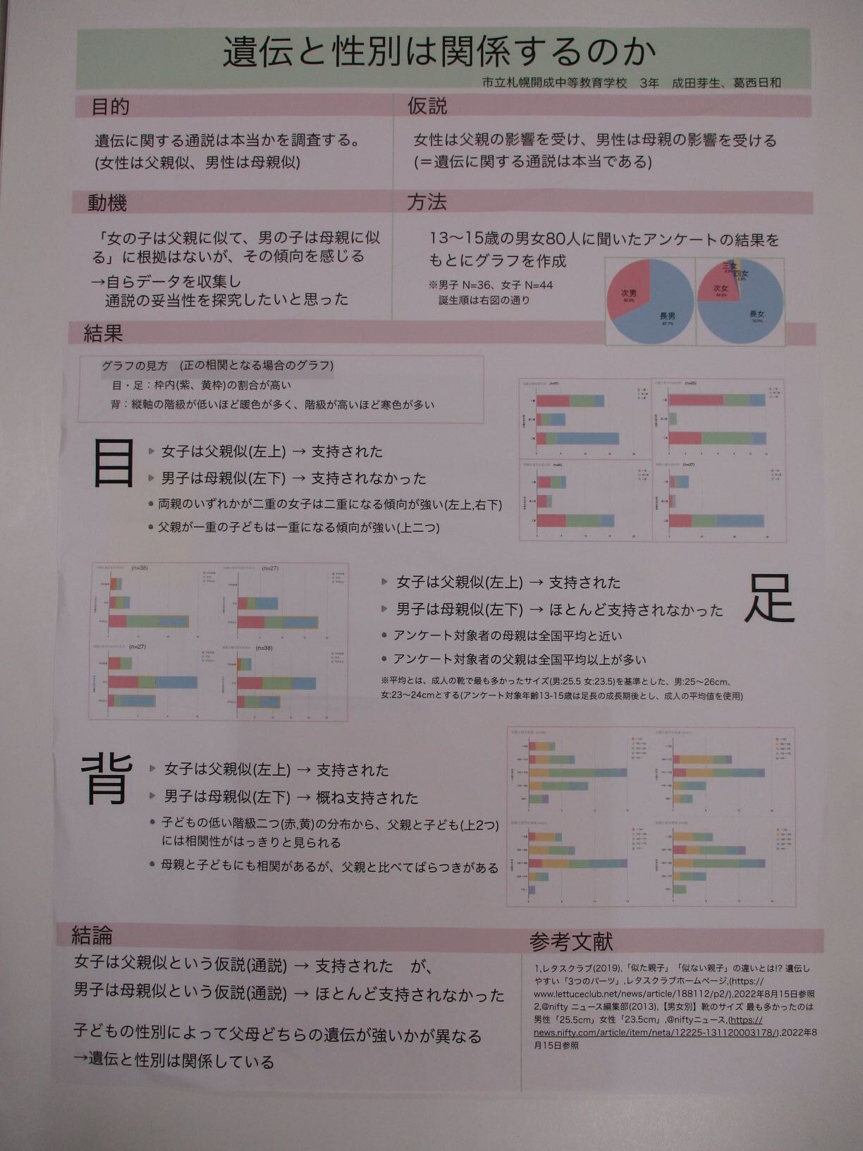 | 佳作 | 遺伝と性別は関係するのか | 成田 芽生 葛西 日和 | 市立札幌開成中等教育学校 | 中3 |