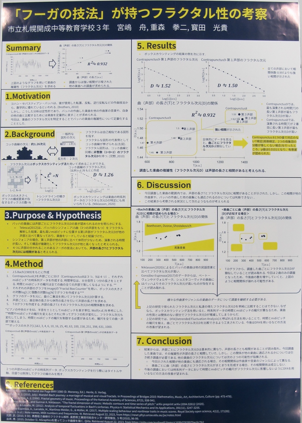 | 佳作 | 「フーガの技法」が持つフラクタル性の考察 | 宮嶋 舟 重森 拳二 寳田 光貴 | 市立札幌開成中等教育学校 | 3 |